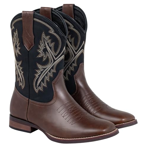 J's.o.l.e Western Mens Cowboy Boots Square Toe Wide Mid Calf Embroidered Pull On Retro Boot Brown 6
