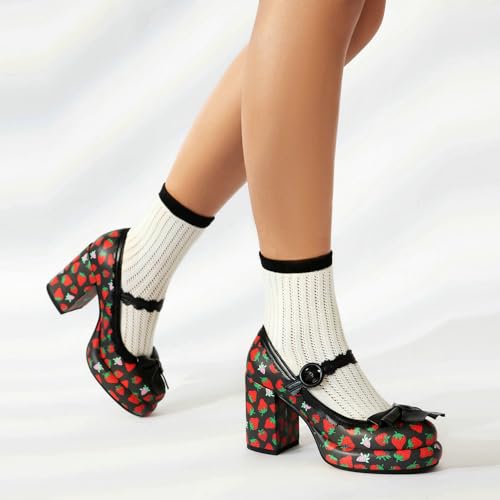 Shinelly Platform Chunky Heels Cute Strawberry Mary Janes Round Toe High Heel Kawaii Pump Shoes 6
