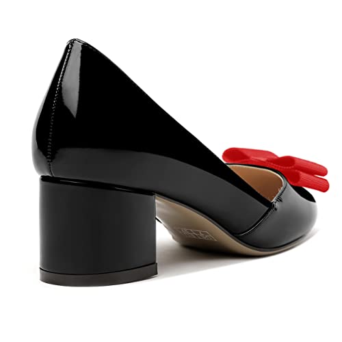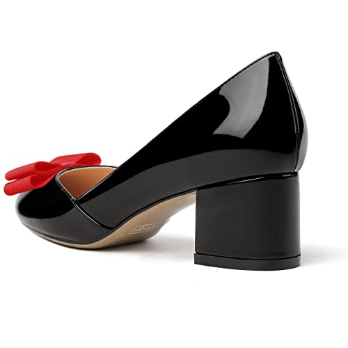MODENCOCO Women's Round Toe Bow Slip On Patent Chunky Low Heel Pumps Office Work Dress Shoes 2 Inch 5