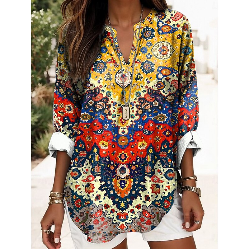Women's Blouse Tunic V Neck Long Sleeve Boho Casual Graphic Geometric Elegant Daily Regular Tops Daily Print Black Yellow Red Blue Gold 10