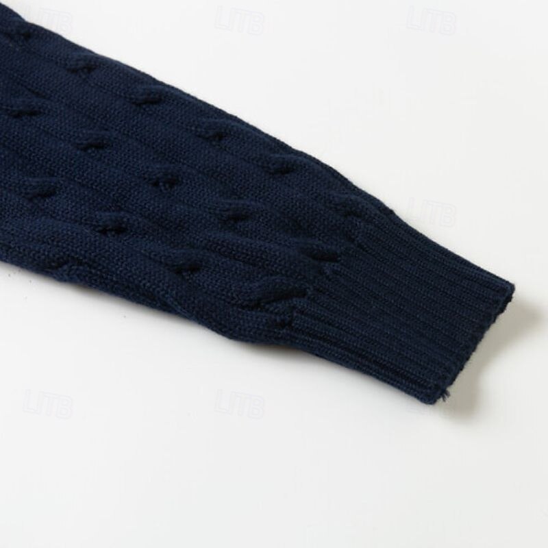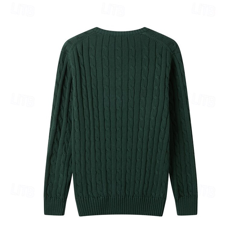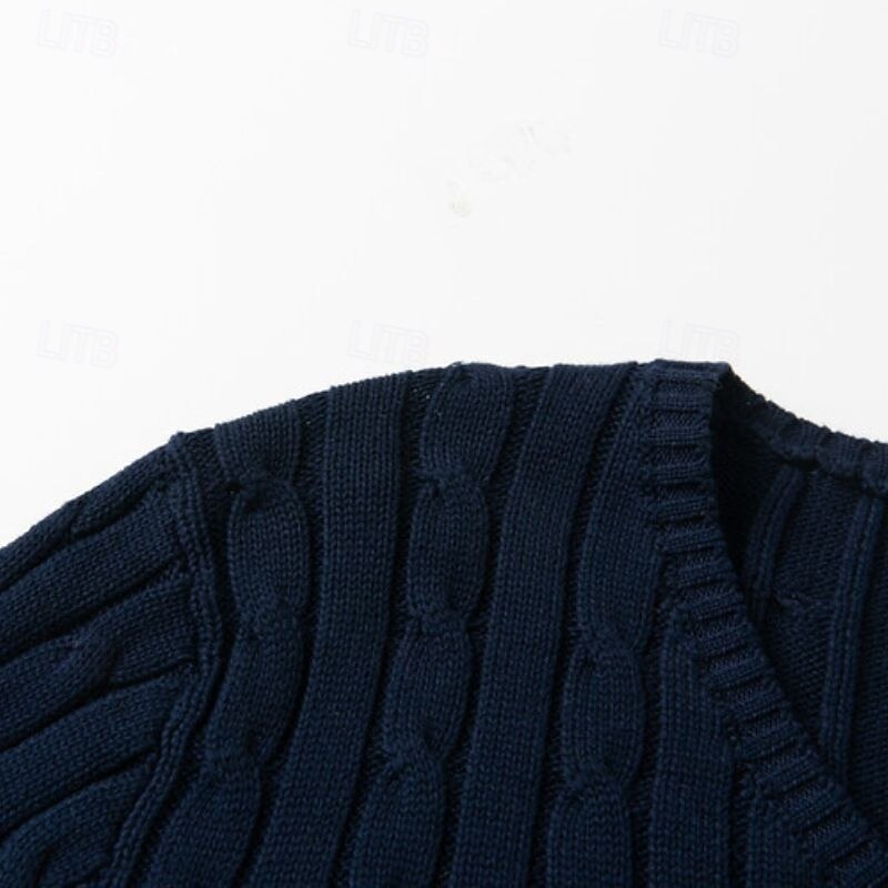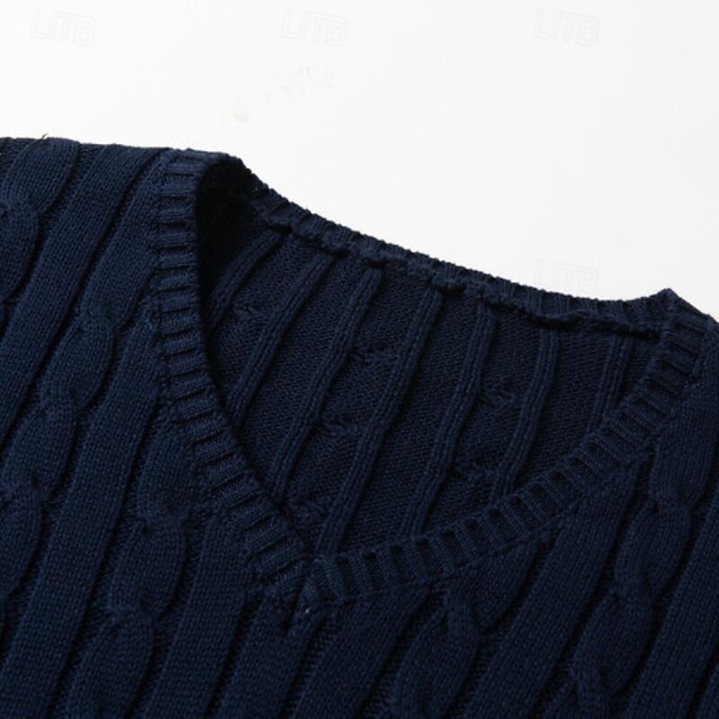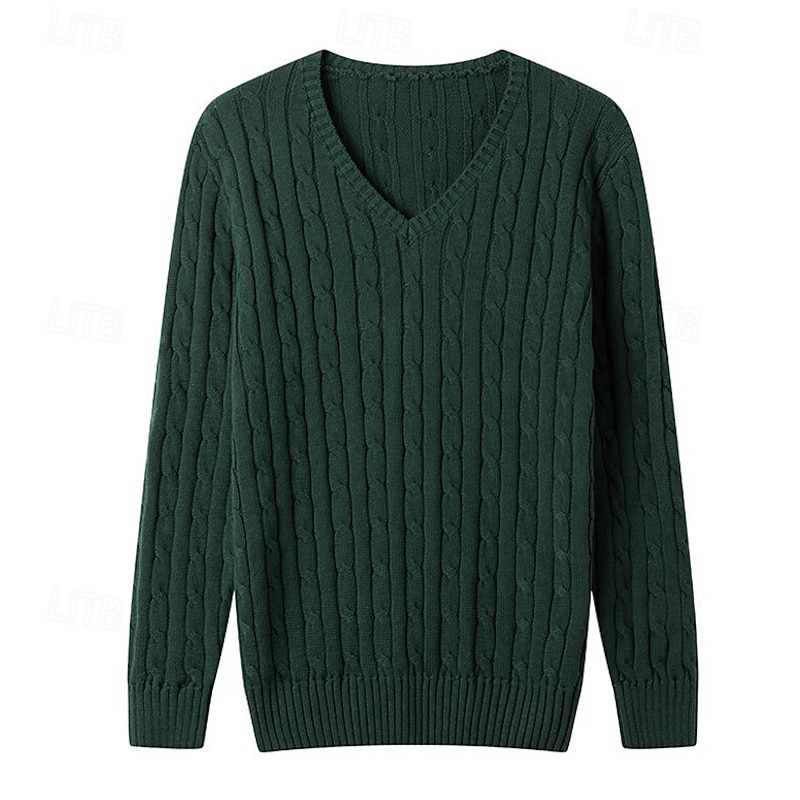 Highlights [Fabric] : Expertly crafted from a soft 90% cotton blend, this men's V-neck pullover sweater ensures comfort and warmth, ideal for fall and winter wear. The cable-knit and ribbed fabric adds texture and visual interest to the design. [Fit] : Featuring a regular fit with ribbed cuffs and hem, this sweater offers a classic silhouette that flatters various body types. The stretchy fabric allows for ease of movement and comfortable wear throughout the day. [Design Highlights] : The sweater's knitted design includes a ribbed and cable-knit pattern, providing a sophisticated touch to the overall look. The V-neckline is perfect for layering with collared shirts, offering versatility in styling. [Occasions] : Suitable for casual outings, daily wear, date nights, and vacation settings, this sweater transitions seamlessly from relaxed to slightly more formal occasions. Its rich color options, including dark navy and dark green, enhance its adaptability. [Size Range] : Available in sizes M, L, XL, 2XL, and 3XL, this sweater accommodates a broad range of sizes, ensuring a perfect fit for many body types.
