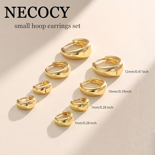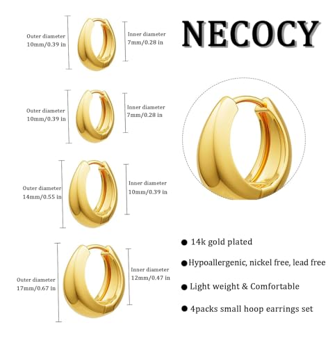 Material: BrassMetal type: BrassBack Finding: Push BackEarring design: HoopGem type: No GemstoneItem type name: Hoop EarringsMultiple Sizes & Colors: The small hoop earrings is available in diameters of 7mm, 8mm, 9mm, 10mm, and 12mm. Colors include gold, silver, and rose gold. Hoop earrings set can be worn individually or stacked as you likeClassic & Fashion: Chunky hoop earrings stack is very layered and suitable for multiple piercing. lovely, classic and versatile never out of fashion. Can match any outfit on any occasion, especially suitable for daily wear and workMaterial of Earrings: 14k gold plated cute hoop earrings. Hypoallergenic, waterproof, nickel free, lead free, non tarnish and long-lasting. Perfect for sensitive skin. Comfortable to wear all day. The clasps are sturdy and easy to put on and take offPerfect Gifts: The thick gold hoops earring sets come with a beautiful package. Perfect jewelry gift for women of all ages. Suitable for various occasions such as prom, wedding, birthday, Christmas, Valentine's Day, party, date, anniversary and so onWhy Choose Us: NECOCY team strictly control the quality of our products. Make products that satisfy customers. Your satisfaction is our greatest motivation. If you have any questions, please contact us and we will reply you within 24 hours Perfect for everyday use. supreme materials and excellent craftsmanship ensure long-lasting durability.