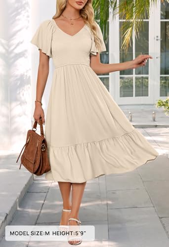 HOT ! MEROKEETY Women's Summer Casual V Neck Ruffle Sleeve Smocked High Waist Midi Dress with Pockets