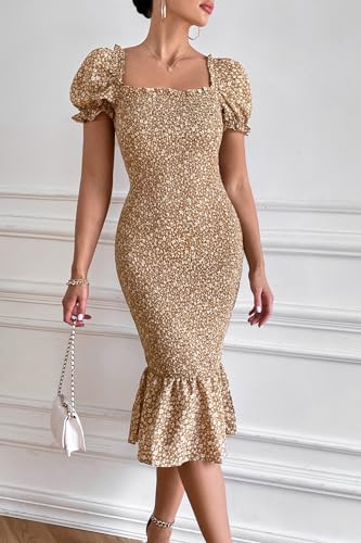 • ELEGANT SUMMER BOHEMIAN DRESSES! This Midi Length Mermaid Dress Is A New Fashion For You. Fitted Bodycon Dress Perfectly Highlights Your Body Curves, Showing Off Your Fascinating Figure. Summer Dress With Short Puff Sleeves Features Overall Ditsy Floral And Ruffle Hem, Adding A Touch Of Cuteness. Square Neck And Backless Dress Is Suitable For Wearing In Summer, Providing Comfy Dressing Experience While Showing Your Charm