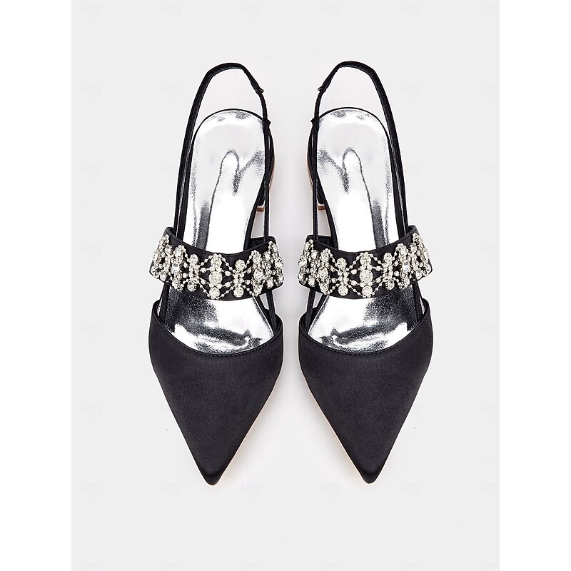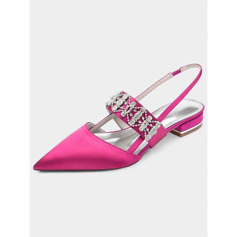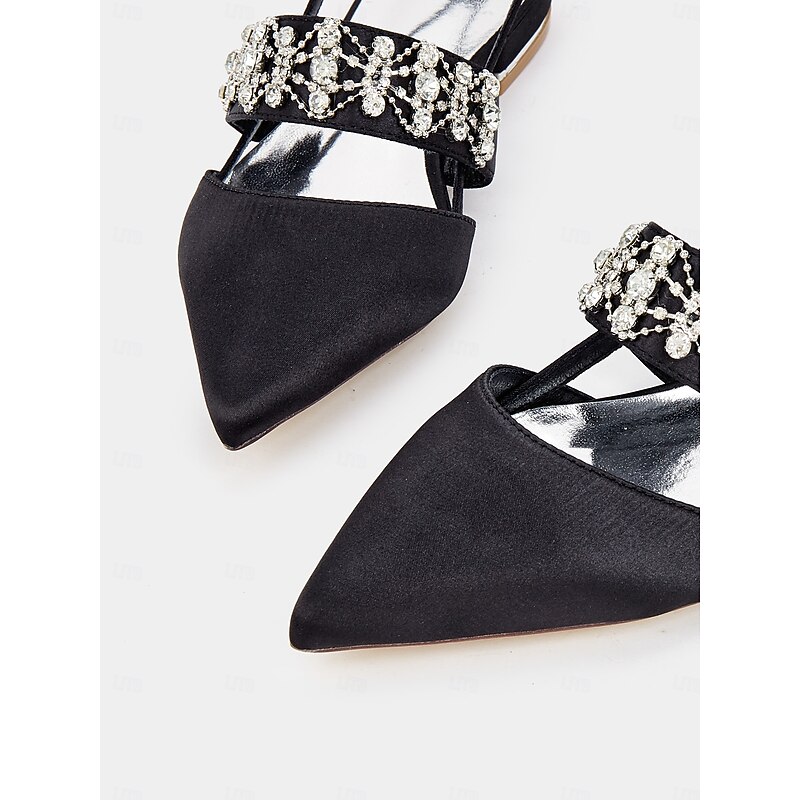 Highlights [Fabric] : Crafted from luxurious satin, these flats offer a sleek and sophisticated look with synthetic leather lining that provides enhanced comfort for prolonged wear. The satin material adds an elegant sheen that makes these shoes perfect for any season. [Silhouette] : These flats feature a pointed-toe design that exudes elegance and style. The low square heel ensures comfort and practicality, making them ideal for extended wear without compromising on sophistication. [Design Highlights] : The standout feature of these slingback flats is the intricate arrangement of sparkling rhinestones on the straps. These embellishments add a touch of glamour and make the shoes a perfect choice for formal events. The easy-to-use buckle closure on the slingback strap ensures a secure fit. [Occasions] : Perfect for parties and other formal occasions, these flats seamlessly complement a variety of outfits, from elegant dresses to chic skirts and tailored pants, making them a versatile addition to any wardrobe. [Size Range and Fit] : Available in a range of sizes from US6 to US13, these shoes are designed to fit true to size, allowing you to select your usual size for a perfect fit.
