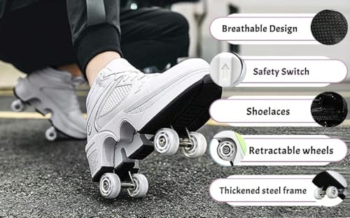 2 in 1 Roller Shoes PU Leather Outdoor Deformation Roller Skates for Men Women, Retractable Automatic Walking Sneakers with Wheels Comfortable High-Top Casual 2