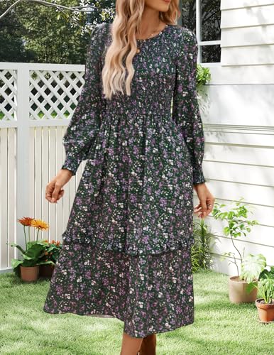 Kate Kasin Long Sleeve Midi Dress for Women, Casual Smocked Vintage Midi Dresses, Modest Fall Floral Wedding Guest Dress 1