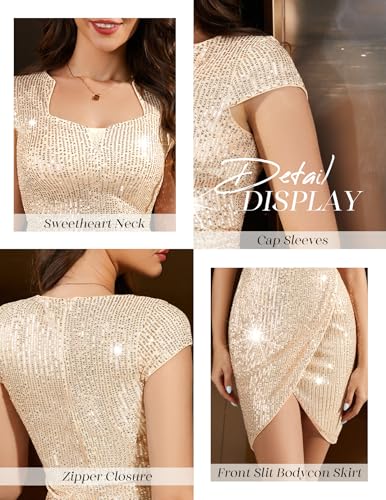 • Features: full lined, comfortable to wear, some stretch, glitter eye-catching sequins, sweetheart neckline, cap sleeves, front slit, ruched, bodycon fit, above knee length, hidden back zipper, perfect choice for cocktail dresses for women