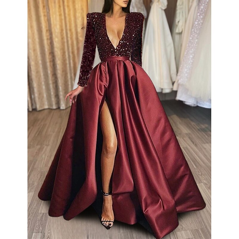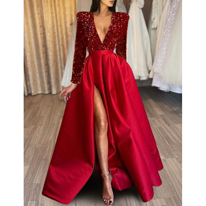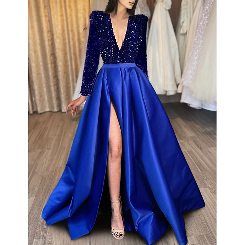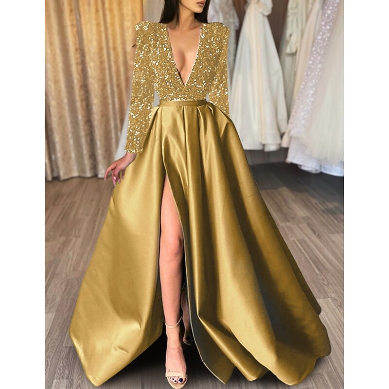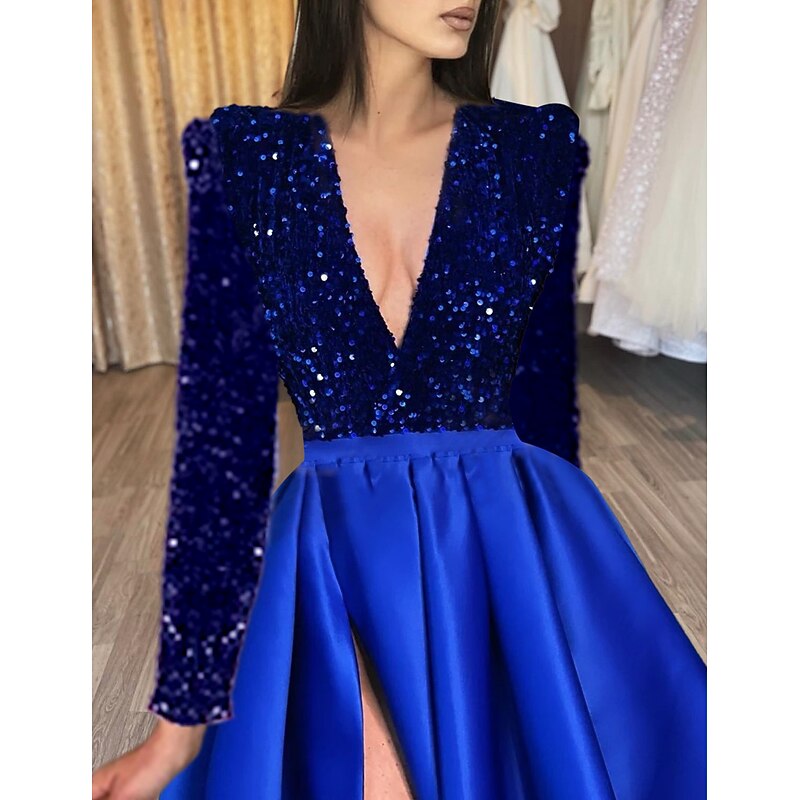 More information about A-Line Evening Gown Sparkle & Shine Dress Formal Wedding Court Train Half Sleeve V Neck Satin with Sequin Slit Masquerade Dress