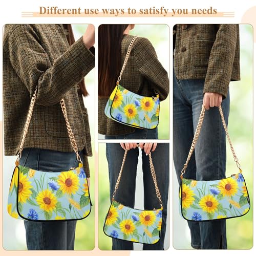 Bright Sunflowers Blue Floral Tote Handbag Womens Lady One Shoulder Bag Hobo Purse Clutch Zipper Closure Chain Strap 4