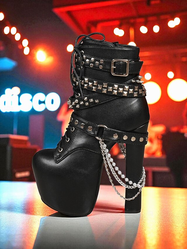 More information about Women's Black Platform Gothic Biker Ankle Boots – Faux Leather Lace-Up Heels with Studded Straps and Chains for Punk Concerts, Clubwear and Alternative Fashion