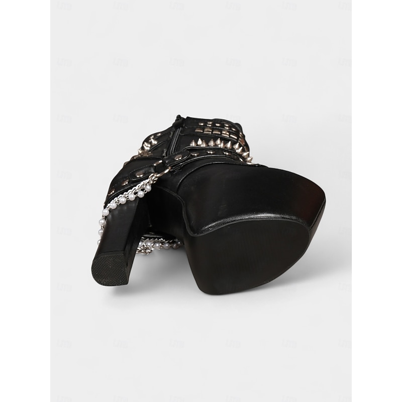 HOT ! Women's Black Platform Gothic Biker Ankle Boots – Faux Leather Lace-Up Heels with Studded Straps and Chains for Punk Concerts, Clubwear and Alternative Fashion