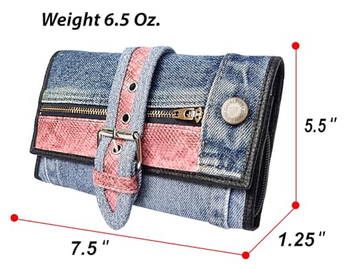 More information about Upcycling Bifold Denim Wallet Decorated Snake skin PU leather Zipper and Buckle Accents Long Wallet Clutch Purse for Women (Pink)