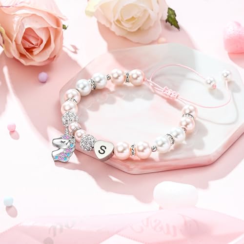 Hidepoo Unicorn Bracelet Gifts for Girls - Adjustable Pink Pearl and Rhinestone Balls Heart Initial Unicorn Bracelets Jewelry CZ Unicorn Bracelet Birthday Gifts for Girls 1