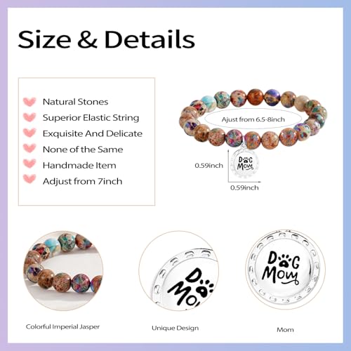 • 【Material&Size】:The Dog Mom Bracelet for women size is 6.5-8", weight: about 19g,Crafted with the highest quality materials,The beads are made of 8mm Natural Colorful Imperial Jasper .