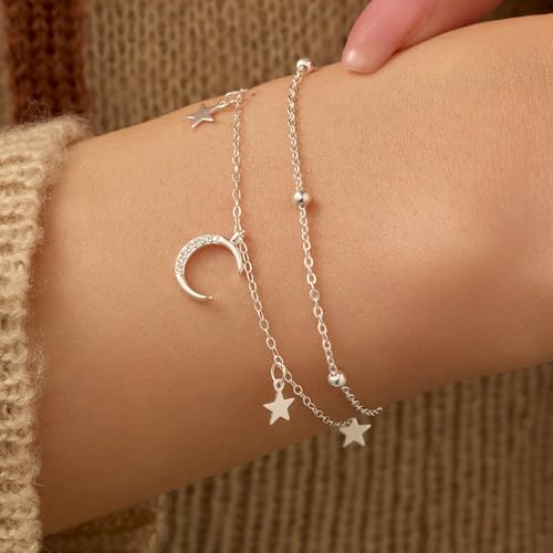 925 Sterling Silver Dainty Moon Star Link Bracelet for Women Sparkling Cubic Zirconia Layer Charm Bracelet Hypoallergenic Adjustable Chain Trendy Personalized Jewelry for Mom Daughter Wife Teacher Christmas Wedding Jewerly Gift 1