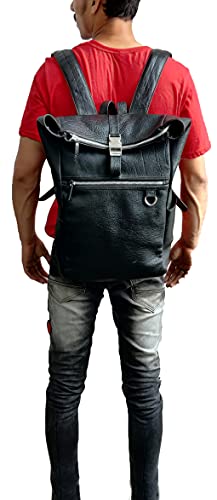 Jaald 45 cm Leather Backpack Large Messenger Backpack Cosy Bicycle Backpack Black Genuine Leather Waterproof for Travel Outdoor Hiking Gift Laptop Vintage Leather Backpack for Men Women, Schwarz 1