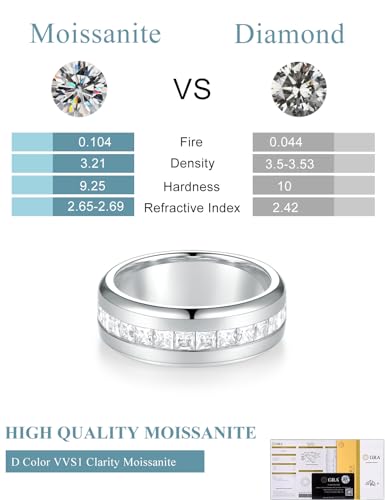 4.35cttw Moissanite Wedding Band Eternity Rings Princess Cut Men Moissanite Ring D Color VVS1 Moissanite Channel Set, Sterling Silver with 18K White Gold Plated Promise Ring for Him 6