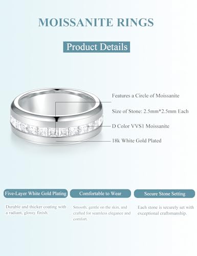 4.35cttw Moissanite Wedding Band Eternity Rings Princess Cut Men Moissanite Ring D Color VVS1 Moissanite Channel Set, Sterling Silver with 18K White Gold Plated Promise Ring for Him 5