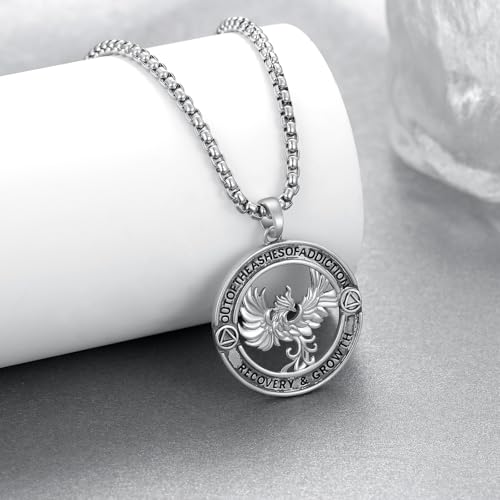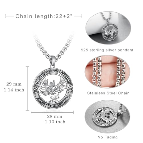 HOT ! Phoenix Sobriety Necklace for Men - 925 Sterling Silver Recovery Pendant with Engraving, Out of The Ashes AA Gift