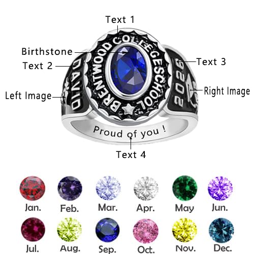 • Customized Class Ring: This is a fully customizable class graduation ring. Choose the color and material type of the mens class rings, choose your birthstone, add the text of your choice and the graphics that best identify you. Click the "Customize Now" button and you can design a unique graduation ring