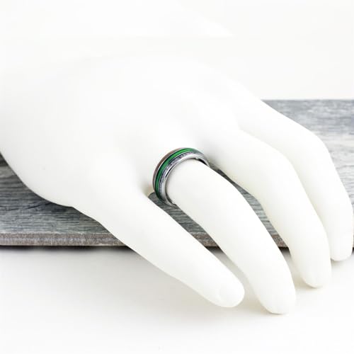 • Stunning Tungsten Carbide low dome band ring in polished finish with real fishing line between whiskey barrel oak wood and deer antler inlays.