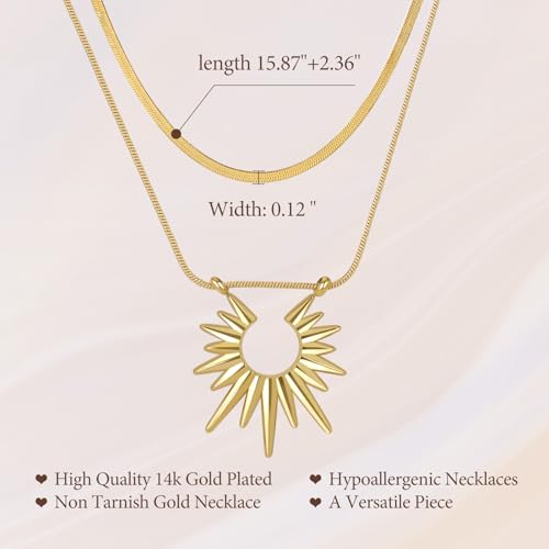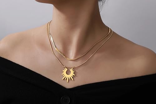 Gold Layered Necklace for Women, 14K Gold Plated Solar Pendant Necklaces Chunky Herringbone Chain Necklaces, Cuba Chain Chocker Waterproof Collarbone Chain Punk Jewelry 1
