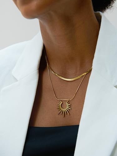 Gold Layered Necklace for Women, 14K Gold Plated Solar Pendant Necklaces Chunky Herringbone Chain Necklaces, Cuba Chain Chocker Waterproof Collarbone Chain Punk Jewelry 5