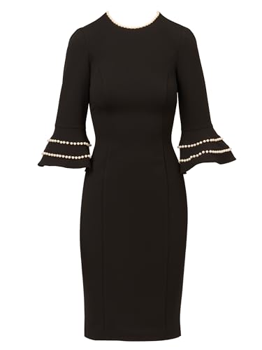 • This is a midi length sheath dress made out of a knit crepe fabric, with a crew neckline, elbow bell sleeves, 2 rows of pearl trim detailing, back slit, and zipper at the center back