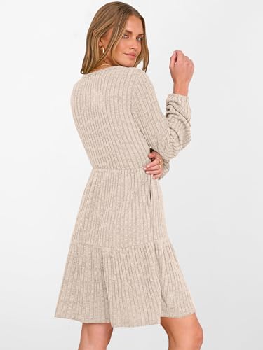 ANRABESS Women's Long Lantern Sleeve Ribbed Knit Dresses V Neck Casual 2025 Fall Winter Flowy Swing Tunic Sweater Short Dress 4