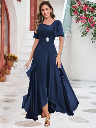 • Features: Chiffon mother of the bride dress, classy v neck, tea length, short flutter sleeves, a line, ruffles, backless, built-in bra, lace-up back, long formal evening gown, ruched waist decorated with sparkly beads, makes you look modest and elegant
