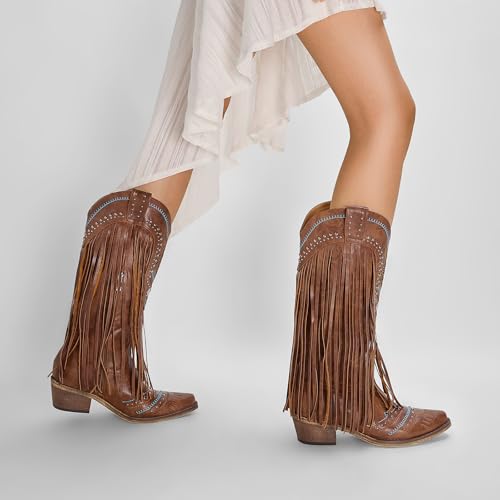 Fringe Cowboy Boots for Women Wide Calf Embroidered Tassal Cowgirl Boot Knee High Snip Toe Pull On Western Shoes 5