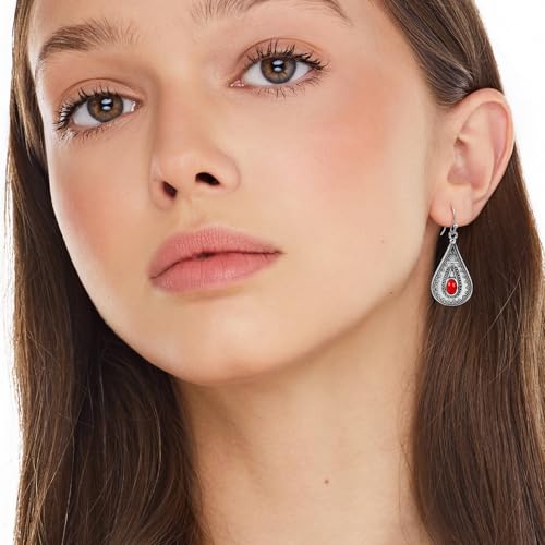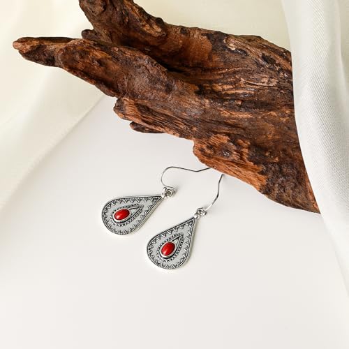 HOT ! Boho Drop Earrings with Red Stone – Silver Teardrop Earrings Featuring Oval Gemstone & Intricate Detailing, Vintage Inspired Boho Jewelry for Women