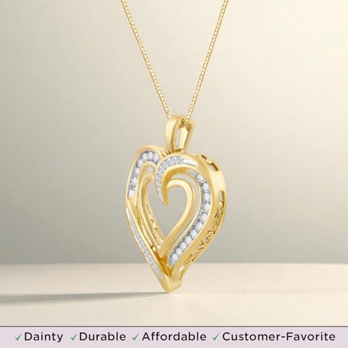• Stunning Heart Pendant in 14K Yellow Gold Over Silver — Features a cluster of natural round and baguette diamonds totaling ½ CTTW, elegantly placed on an 18-inch box chain that adds instant sophistication