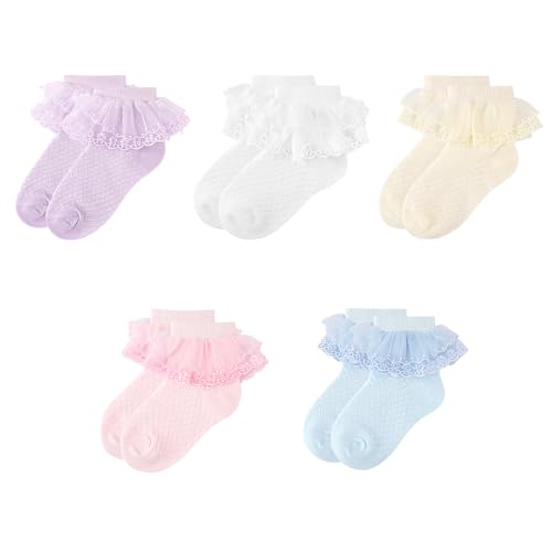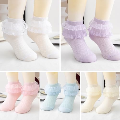 Meeshine 5 Pack Toddler Girls Ruffle Lace Trim Socks Eyelet Mesh Frilly Ankle Socks Princess Dress Soft Cotton Kids 5