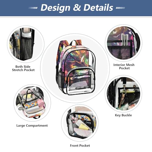Sturdy Bag Material: Comes with durable see through PVCmaterial. The bag is waterproof and easy to clean. When raining, you don’t need to worry about your belongings getting wet.Clear Backpack Size: 10.6L×5.1W×15.7H, can fit A4 books and folder,Laptop,books,water bottles,umbrella and other things. We adopted wide shoulder straps,and you will not feel tired even though you take all your daily stuffs.Multi Pockets: Two mesh pockets on the sides of the bag for your water bottle, tissue or umbrella.The front patch pocket contains a small mesh slip pocket for storing small items.exclusive Design: The main body of the clear bag is made of transparent PVC, with printed patterns on the back and shoulder straps. Make you different from other transparent backpacks.Convenient for Use: This transparent Bookbag can be used in many occasions, such as concerts, sporting,security checks, schools, sports fields, travel, shopping. You don’t need to open your bag when checked. Perfect for everyday use. top-grade materials and excellent craftsmanship ensure long-lasting durability.