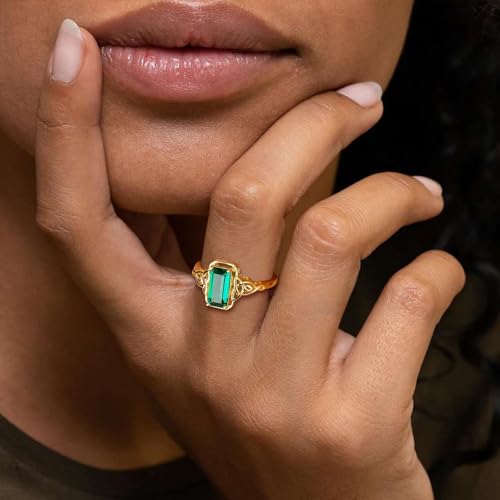Celtic Knot Ring Sterling Silver 14K Yellow Gold Plated Lucky Trinity Emerald Cut Engagement Rings Amethyst/Peridot/Aquamarine/Ruby/Blue Topaz/Green Emerald/Sapphire Solitaire Signet Ring for Women 1
