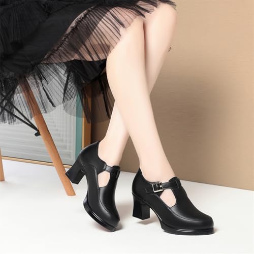 More information about Women's Slip-On Black Genuine Leather Square-Toe Chunky Heel Mary Janes Shoes with Buckle Accent Comfortable Versatile for Daily Office Work Walking Casual Outings