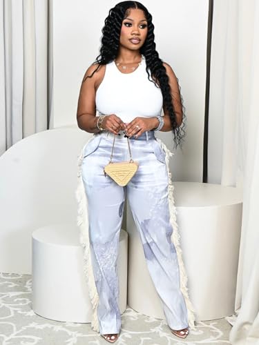 Angsuttc Fringe Pants for Women Print Straight Leg Pant High Waisted Side Tassel Pants 6