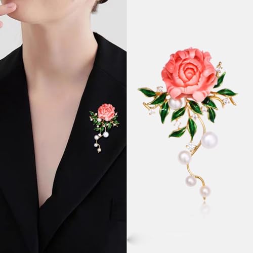 More information about Red Resin Peony Flower Pin with Green Enamel Leaves, Elegant Pearl Accent, Pink Peony Flower, Floral Dress Accessory
