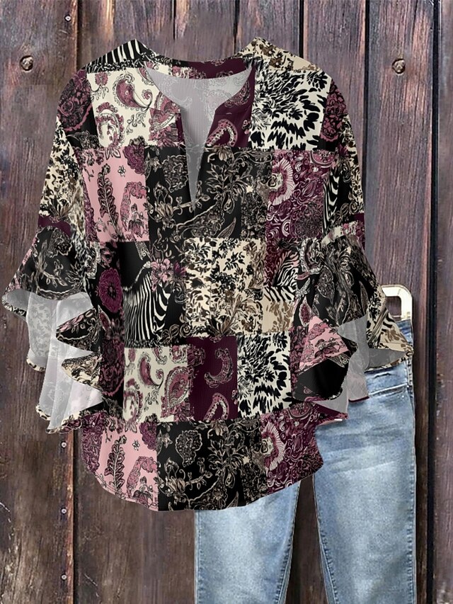 HOT ! Women's Blouse Paisley Retro Vintage Ethnic 3/4 Length Sleeve V Neck Regular Tops Daily Holiday Ruffle Print Black Wine Purple Summer