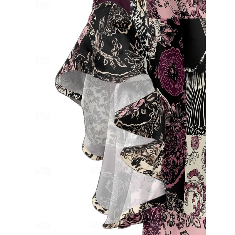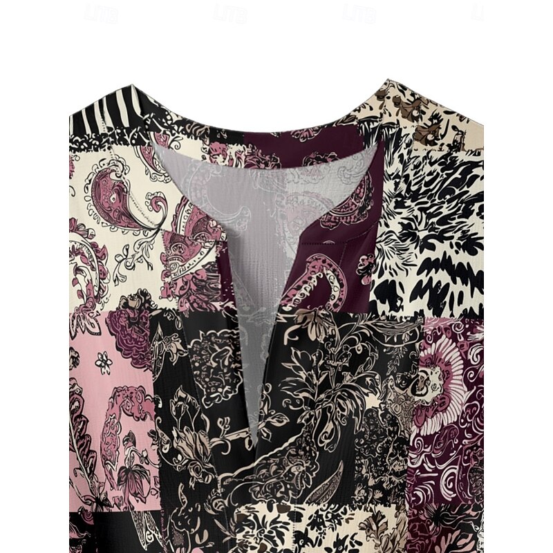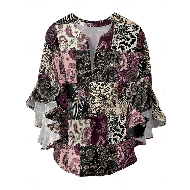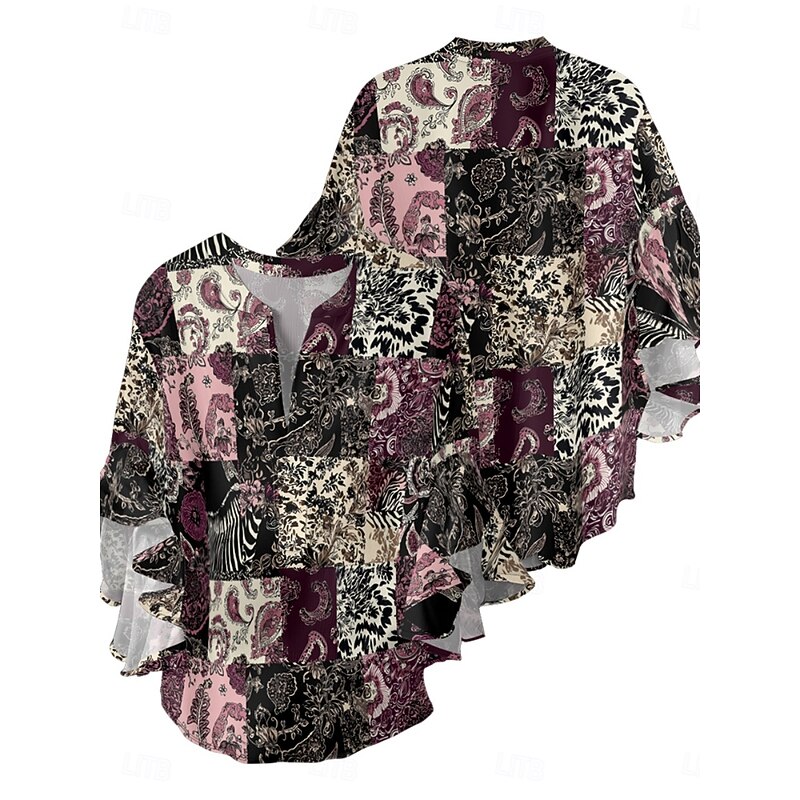 Women's Blouse Paisley Retro Vintage Ethnic 3/4 Length Sleeve V Neck Regular Tops Daily Holiday Ruffle Print Black Wine Purple Summer 7