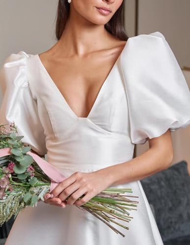 More information about Women's Short Wedding Dresses for Bride Sexy V Neck Satin Puffy Sleeves Mini Bridal Gown A Line Party Dress