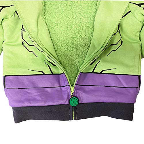 • Zip up Hulk character hoodie jacket in toddler, little boys, and big boys sizing. Lined in soft, warm and plush sherpa.