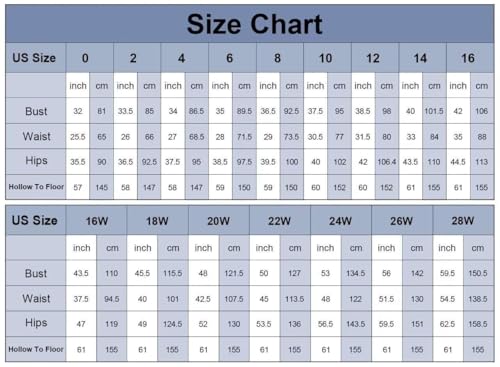 • Free Custom:Please Reference our SIZE CHART on The Image.It is More Accurate to Use Our Size Chart to Choose Your Size.For the Customized Dress,Size /Color:US standard size 0-28Plus,We provide Customize Service.Bust,Waist,Hips,Hollow to Floor,Height,Shoes Heel Height and Color.