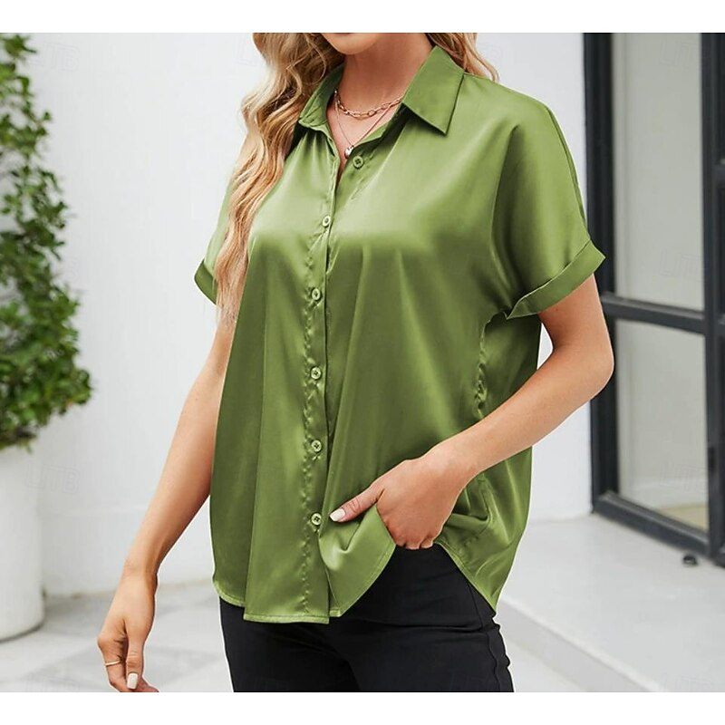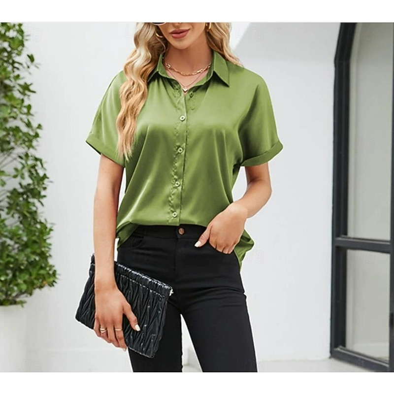 HOT ! Women's Valentine Shirt Blouse Business Solid Color Regular Tops Short Sleeve Shirt Collar Buttons Regular Fit Work Formal Modern Casual Wear Red Green Gray Summer