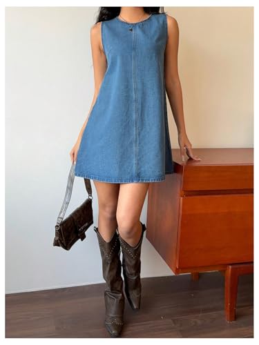 • Feature: Round Neck, Sleeveless, Tie Back, Flared Hem, Mini Short Length, Denim Dress for Women