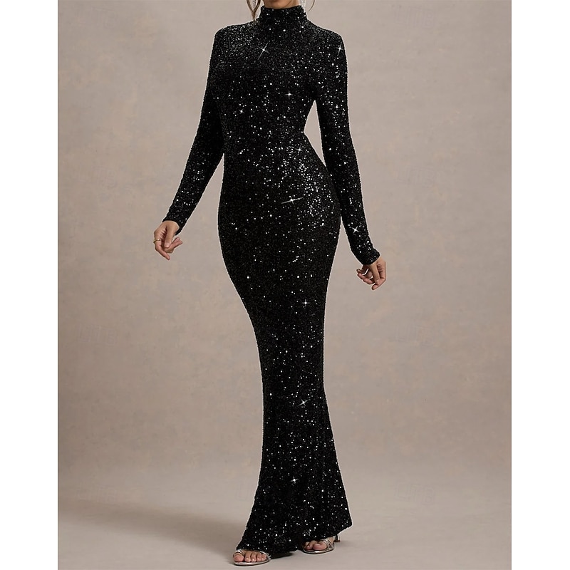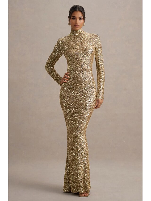 HOT ! Gold Stretch Sequin Mermaid / Trumpet Evening Gown Elegant Dress Formal Wedding Floor Length Long Sleeve Mock Neck with Glitter