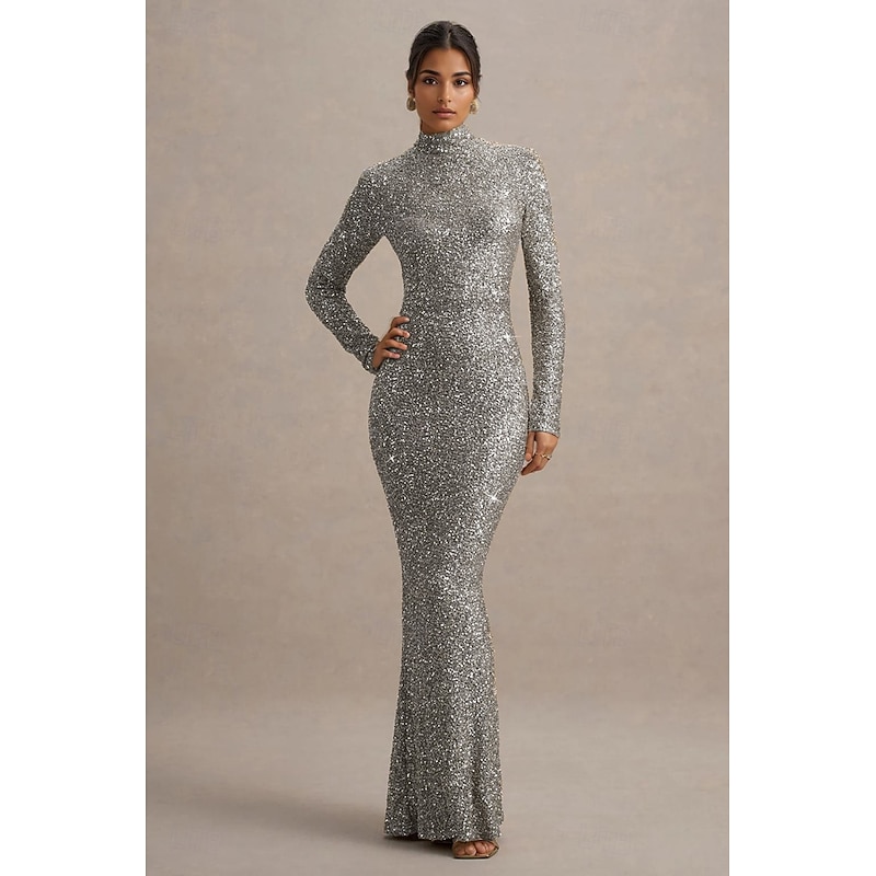 Gold Stretch Sequin Mermaid / Trumpet Evening Gown Elegant Dress Formal Wedding Floor Length Long Sleeve Mock Neck with Glitter 1