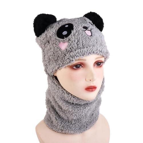 Pokinge 1Pcs Cute Panda Hats Scarf Set,Winter Warm Cartoon Panda Fleece Hat with Scarf Full Face Neck Cover Creative Windproof Plush Cap for Girl Boy Grey 1